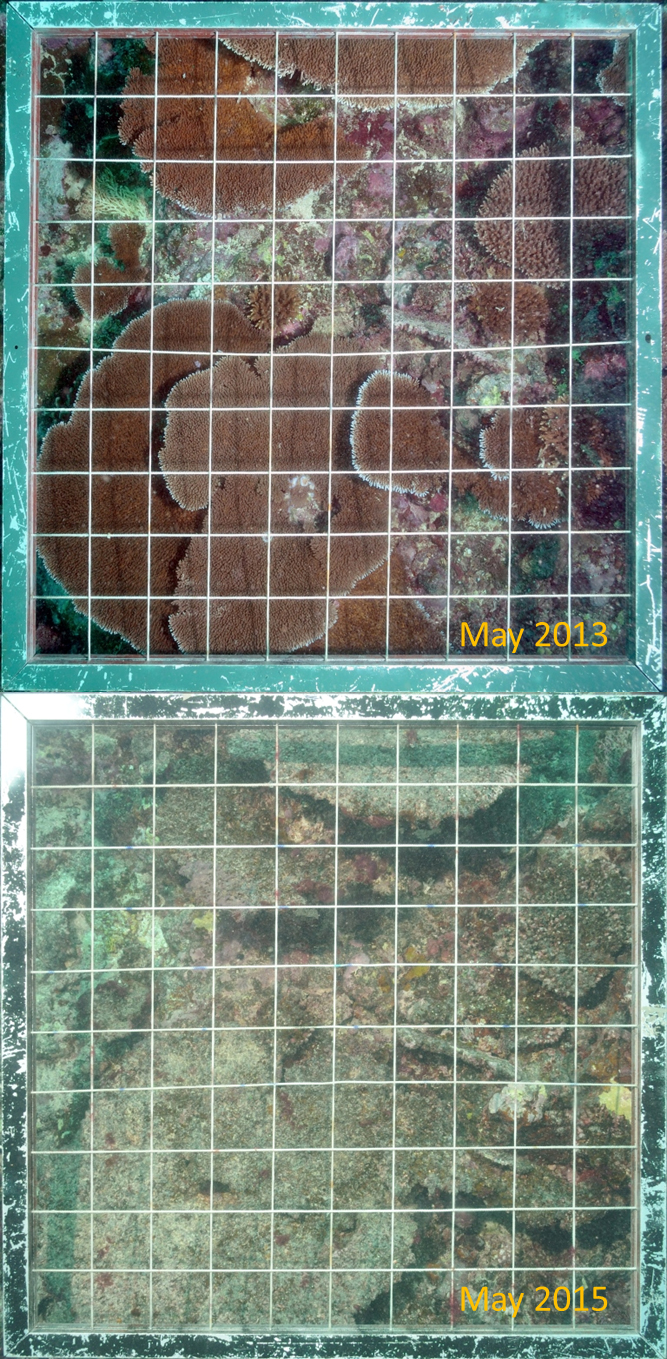 Some coral reefs are threatened around the world due to the effects of coastal development, over-fishing and multiple factors associated with global climate change. In 2013, a monitoring programme was implemented in Western Samoa to document changes in reef communities and the impacts of natural and anthropogenic disturbances. Underwater visual surveys reported the first data on coral cover on the north coast of Western Samoa. Between 2013 and 2015, all living coral genera (Acropora, Leptoria, Montipora, Platygyra, Pocillopora) dropped from 42 % to 0 %. The interaction of crown-of-thorns startfish outbreak in 2010-2014 and unusually high temperature in 2015 could have acted as a deathly combination for the coral reefs in Western Samoa.